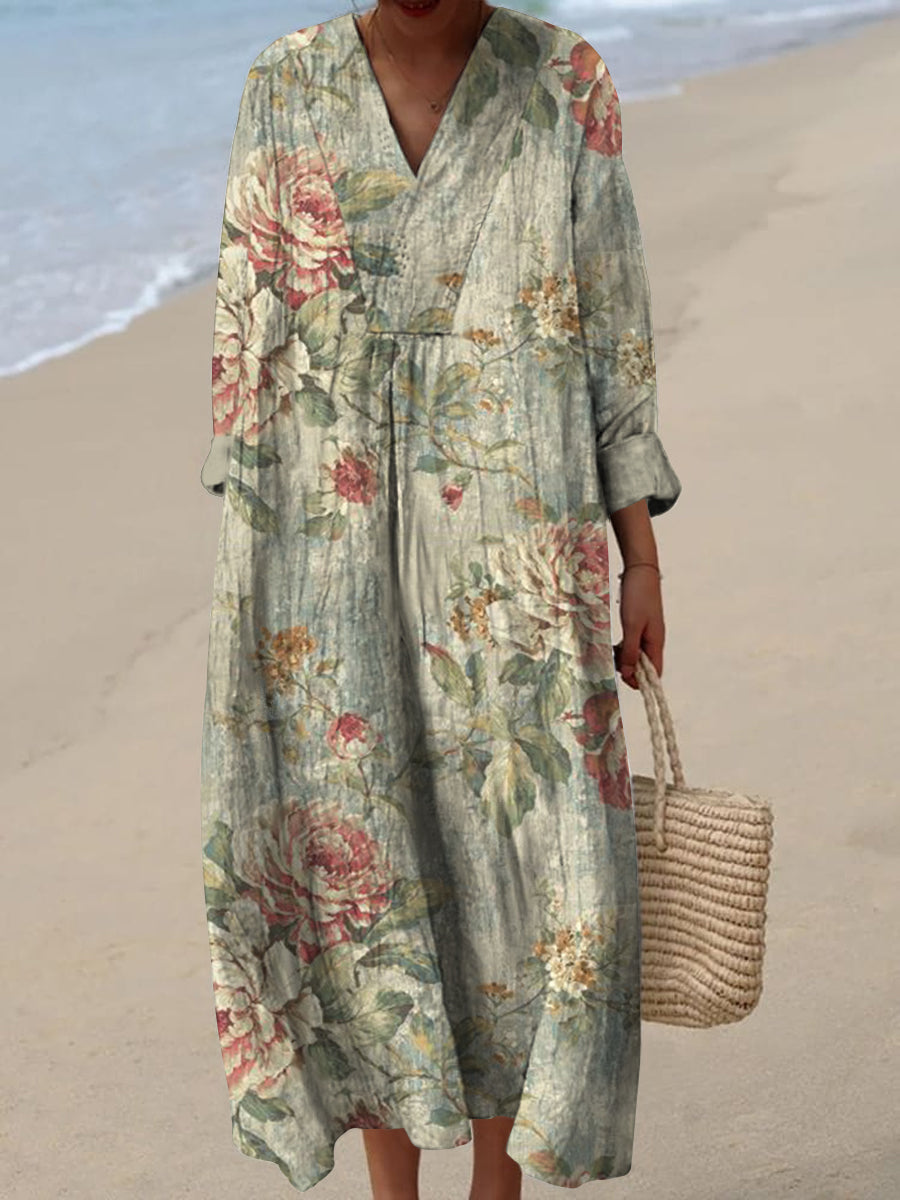 Retro Boho Floral Art Impreso con cuello en V Vintage Chic suelta manga larga Midi Vestido