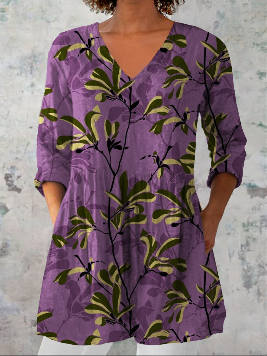 Women's Retro Floral Art Print Casual V Neck Three-Quarter Sleeve Elegant Cotton Linen Top