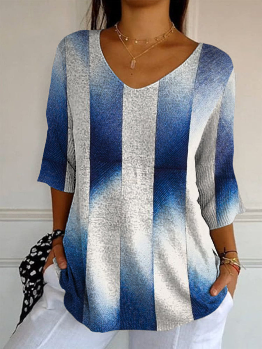 Elegant Retro Floral Print V-Neck Loose Mid-Length Sleeve Top