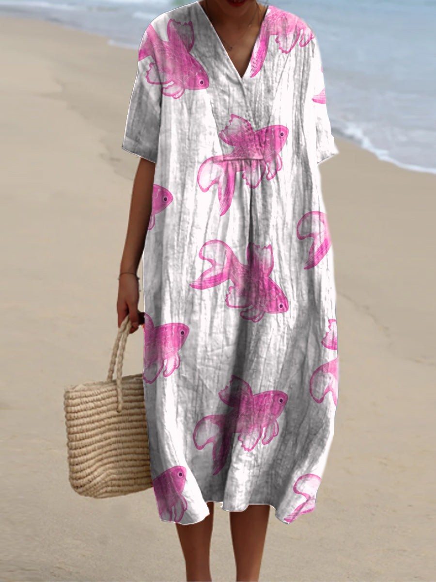 Vintage Fish Art Print V-cuello elegante Chic suelta manga corta vestido de Midi