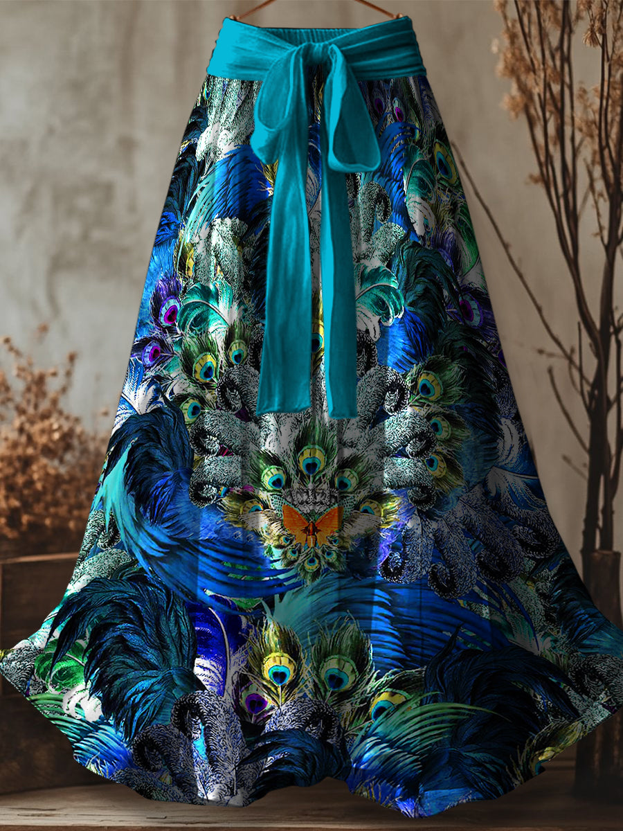 Retro Boho Floral Art Printed Vintage Bow Belt Casual Comfortable Stretch Waist Long Skirt