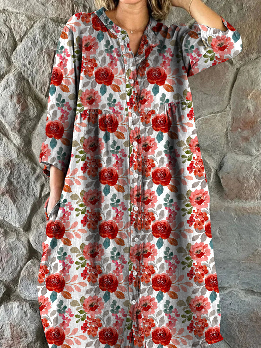 Retro Floral Art Print Vintage Chic con cuello en V botón de manga larga vestido de Midi