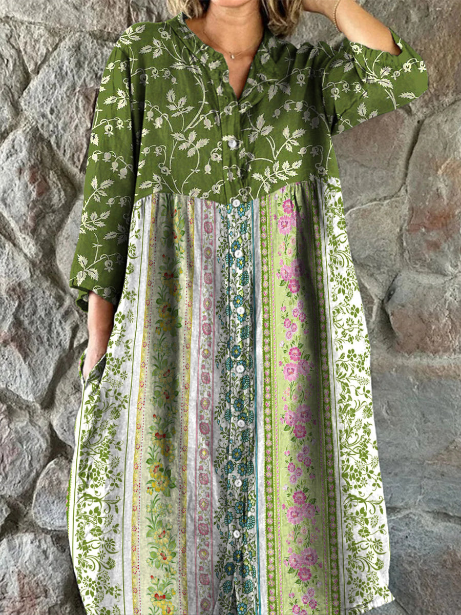 Retro Floral Art Print Vintage Chic con cuello en V botón de manga larga vestido de Midi