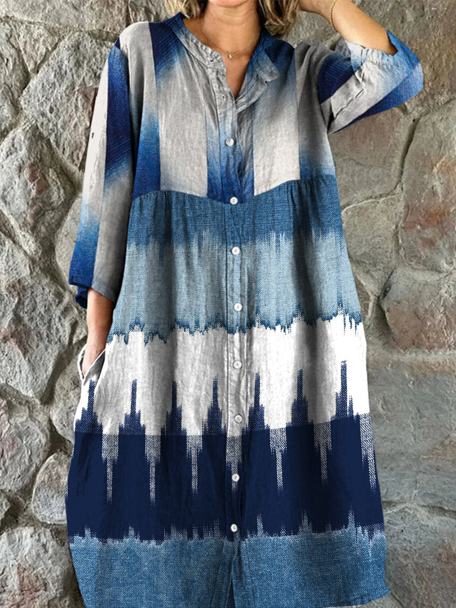 Retro Floral Art Print Vintage Chic V-Neck Button Up Long Sleeve Midi Dress