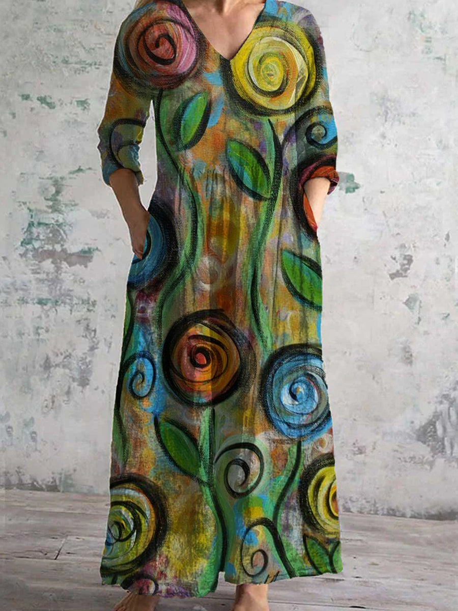 Vintage Art Print Chic V-cuello de tres cuartos mangas elegante vestido de Midi