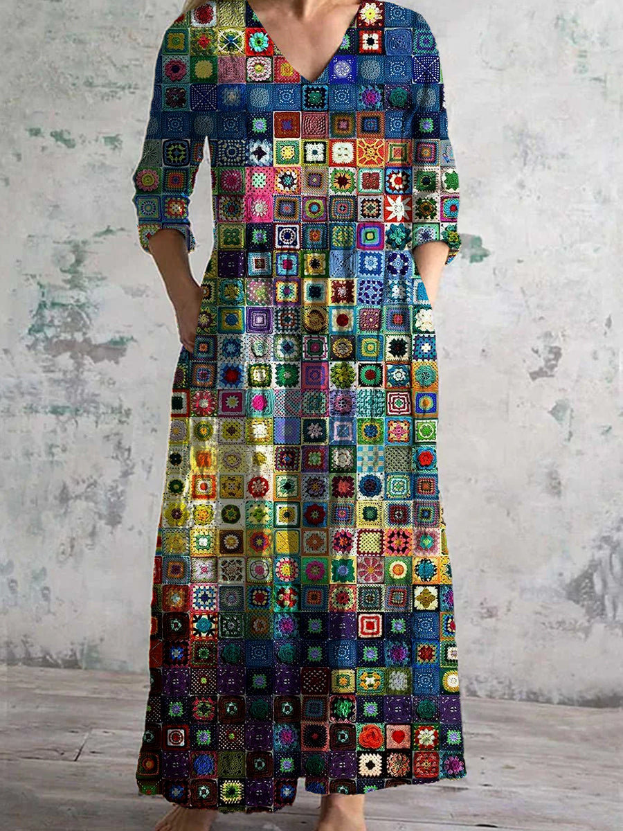 Vintage Art Print Chic V-Neck Three-Quarter Sleeve Elegant Midi Dress