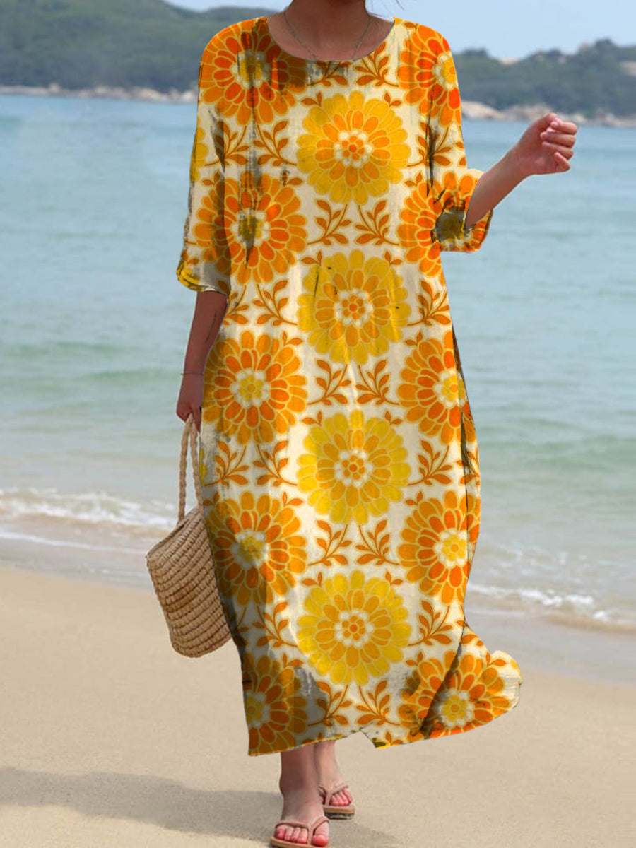 Vintage Bohemian Floral Art Print Chic Round Neck Three-Quarter Sleeve Elegant Midi Dress