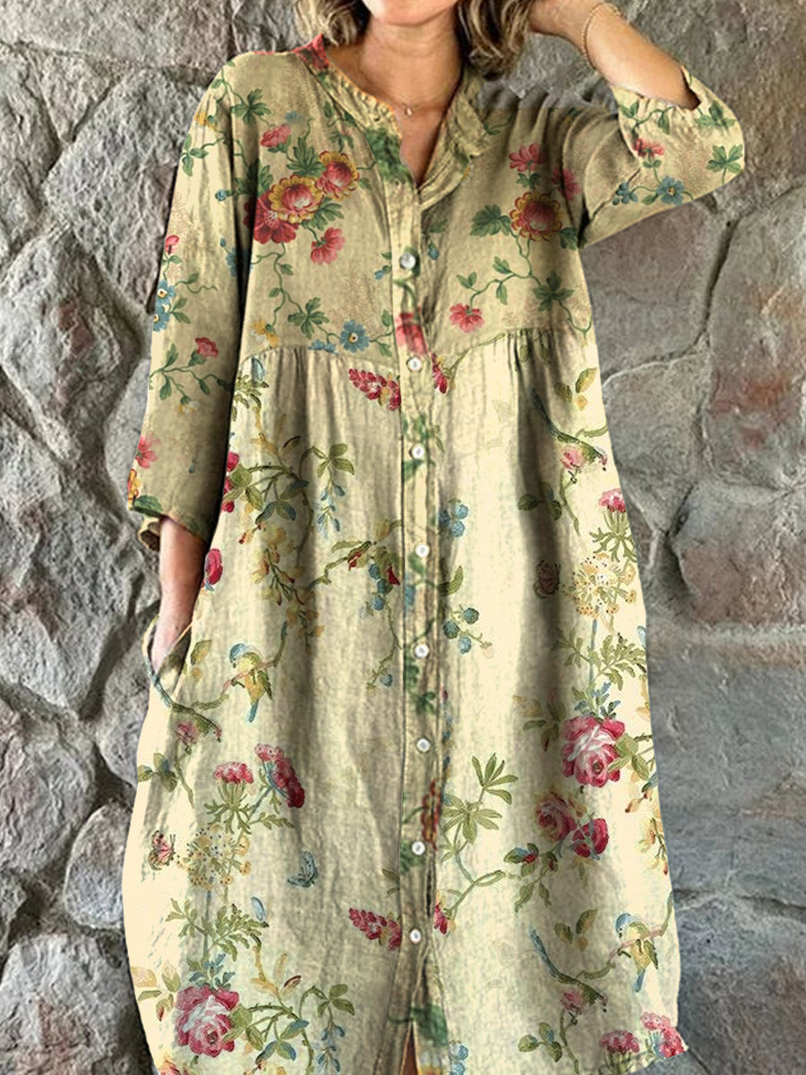 Vintage Bohemian Floral Art Print Chic V Neck Three Quarter Sleeve Button Elegant Midi Dress