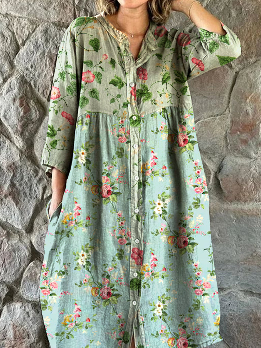 Vintage Bohemian Floral Art Print Chic V Neck Three Quarter Sleeve Button Elegant Midi Dress