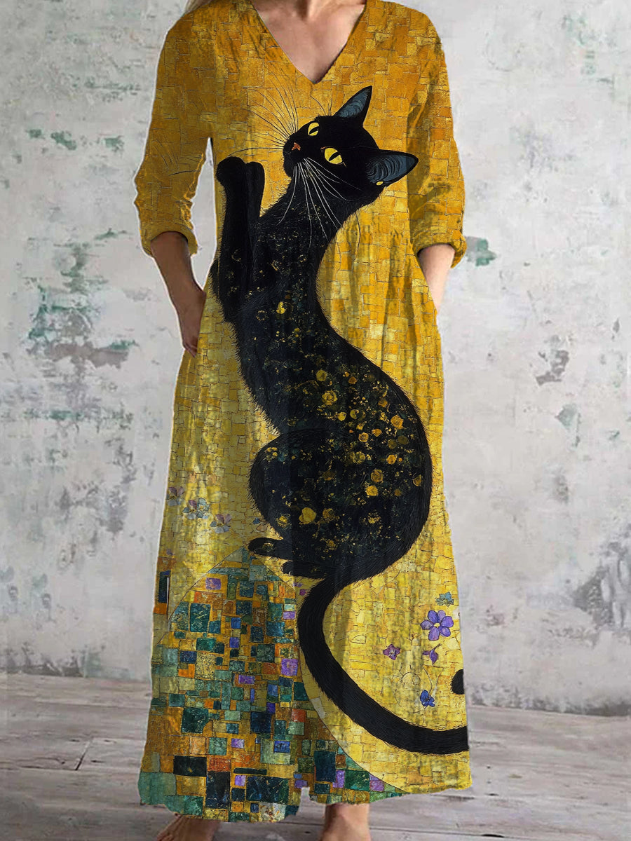 Vintage Cat Art Print Chic V-cuello de tres cuartos mangas elegante vestido de Midi